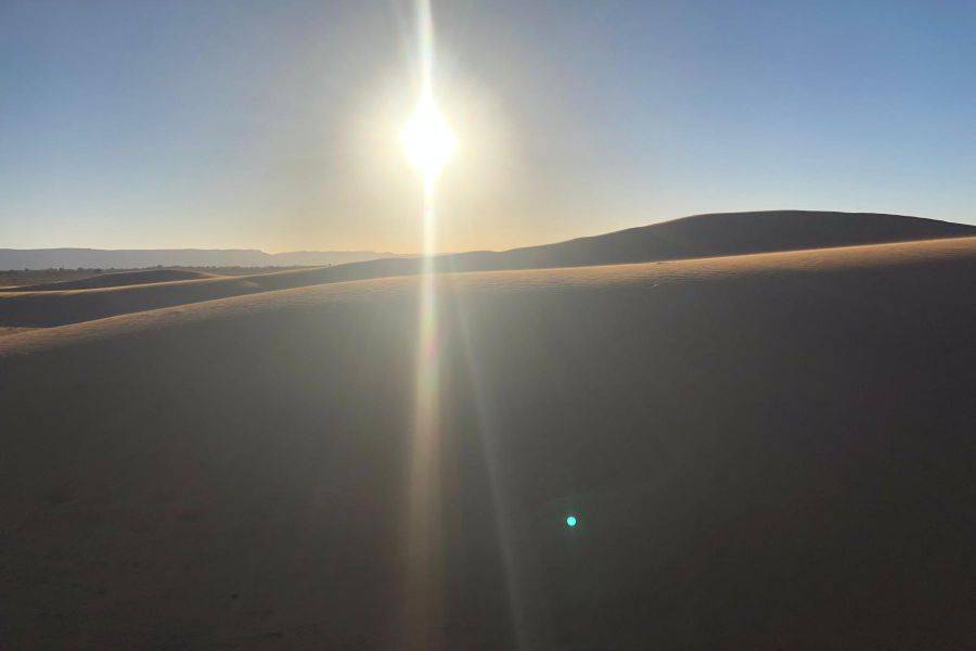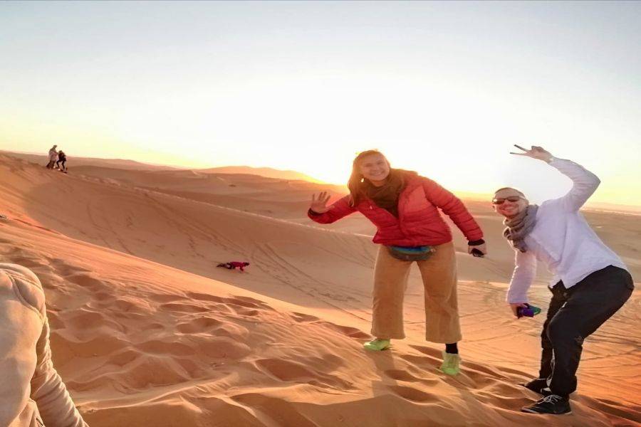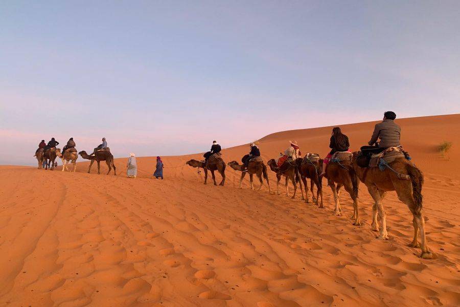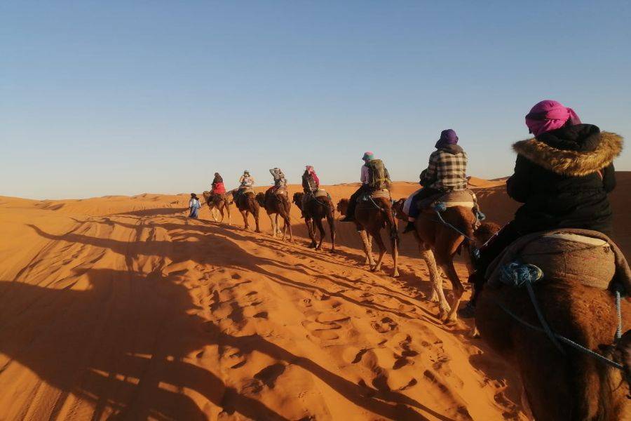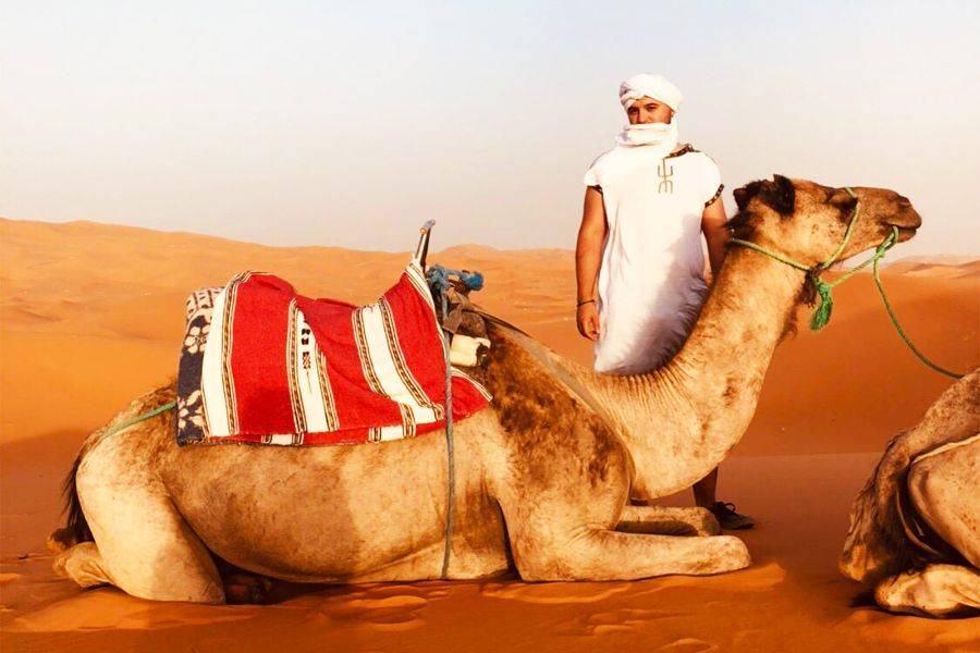 Después de pasar la noche en Merzouga Dunne Eg Chebbi, tome un delicioso desayuno y disfrute del amanecer mientras pasa por el desierto dorado montando un camello.