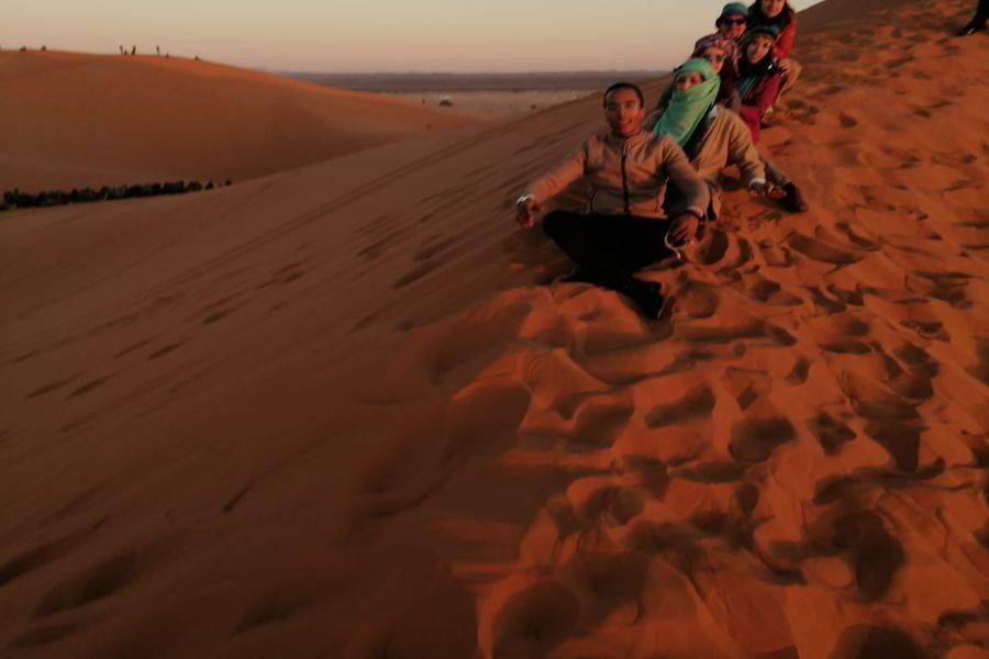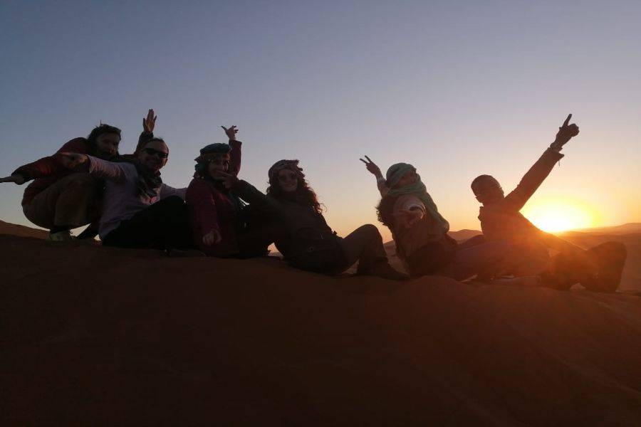 Al llegar a Merzouga, Dunne Erg Chebbi disfruta del paseo en camello para llegar al desierto con un hermoso paisaje de puesta de sol para conocer al personal del campamento del desierto y pasar la noche en el desierto con los instrumentos de la música saharaui.