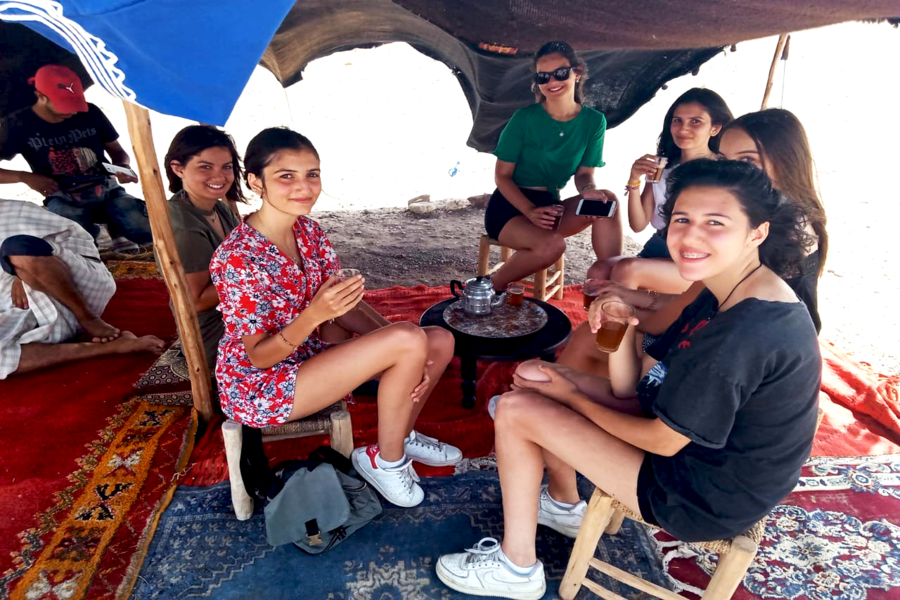 • Mire la encantadora puesta de sol mientras monta en camello con el atuendo del Sahara.